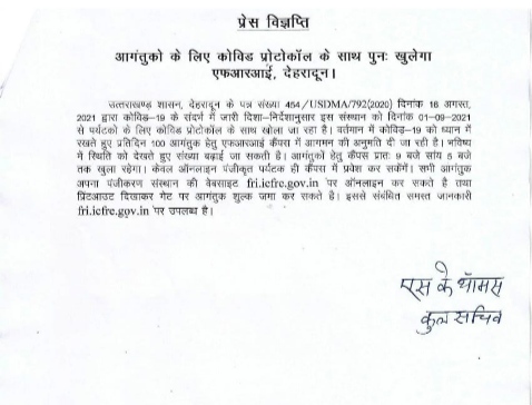वर्तमान में कोविड-19 को ध्यान में रखते हुए प्रतिदिन 100 आगंतुक हेतु एफ0आर0आई0 कैम्पस में आगमन की अनुमति दी जा रही है। भविष्य में स्थिति को देखते हुए संख्या बढाई जा सकती है।