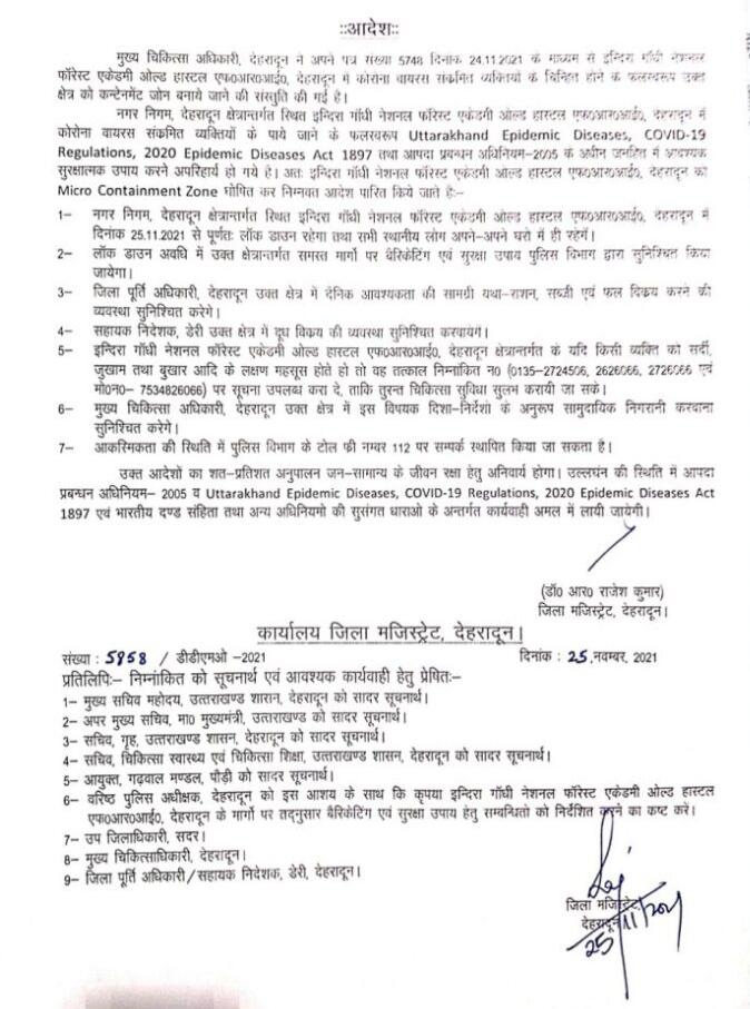 एनटीन्यूज़: कोरोना कहर अभी थमा नहीं दिखाई दे रहा है आज उत्तराखंड के देहरादून जनपद क्षेत्र अंतर्गत इंदिरा गांधी नेशनल एकेडमी ओल्ड हॉस्टल एफ.आर.आई. एवं जी-2 बी-19 तिब्बतन कालोनी डिक्लिन सहस्त्रधारा रोड कुल्हाल में कोरोनावायरस संक्रमित व्यक्तियों के चिन्हित होने के फलस्वरुप क्षेत्रों को कंटेनमेंट जोन घोषित किया गया है।