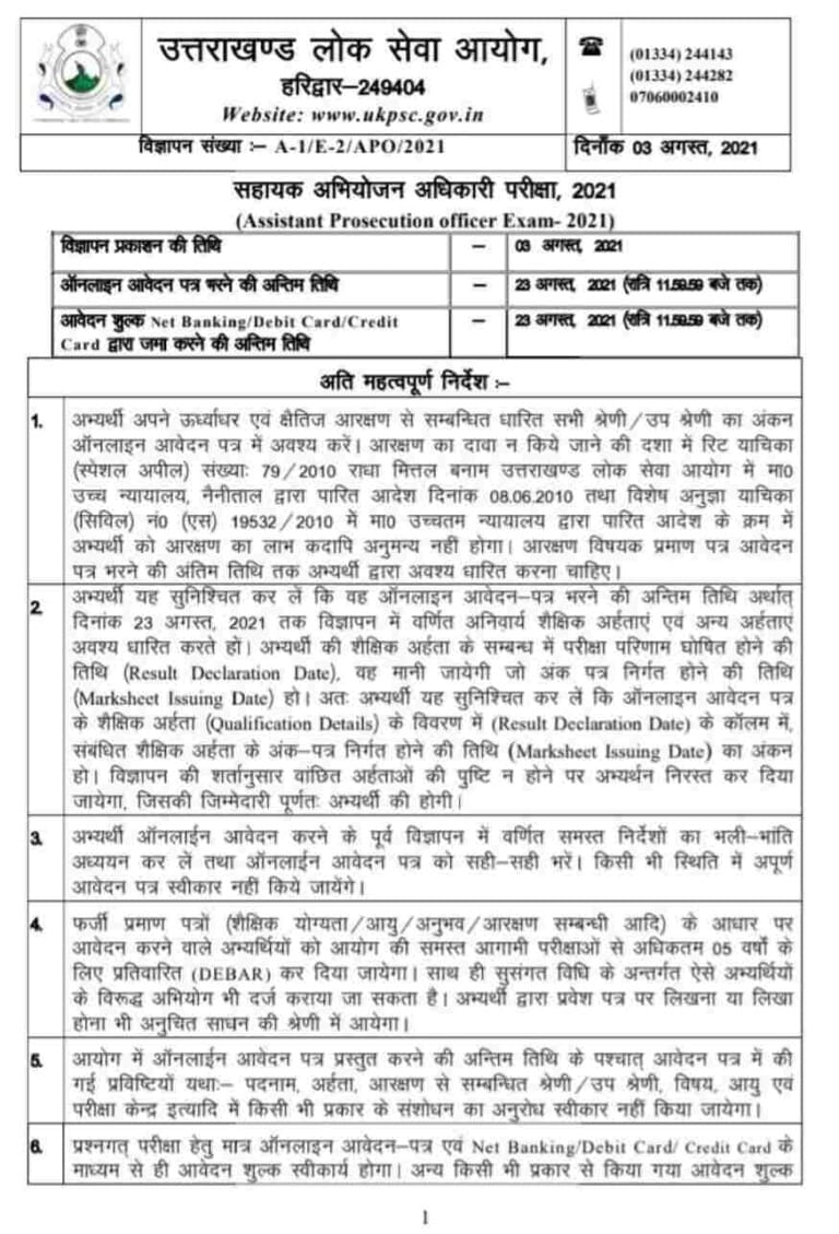 उत्तराखंड लोक सेवा आयोग ने अभियोजन विभाग में रिक्त चल रहे सहायक अभियोजन अधिकारी के पदों पर भर्ती के लिए विज्ञप्ति जारी की है।