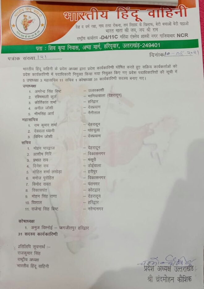 कार्यकारिणी घोषित करते हुए चंद्रमोहन कौशिक ने कहा की मे आशा करता हूं कि सभी नवनियुक्त निष्ठावान, प्रतिभावान, संघर्षशील साथी हिंदू हित, समाज हित के साथ-साथ प्रदेश एवं देश हित में उत्कृष्ट कार्य करते हुए उत्तराखंड में भारतीय हिंदू वाहिनी को सशक्त एवं मजबूत बनाने का कार्य करेंगे.