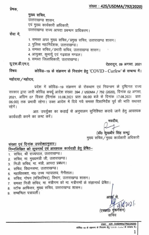 आदेश में लिखा गया है कि प्रदेश में कोविड-19 संक्रमण के रोकथाम एवं नियन्त्रण के दृष्टिगत राज्य सरकार द्वारा जारी कोविड कर्फ्यू आदेश संख्या: 394 / USDMA / 792 (2020), दिनांक 02 अगस्त, 2021 अग्रिम 07 दिवस (दिनांक 10.08.2021 प्रातः 06:00 बजे से दिनांक 17.08.2021 प्रातः 06:00) तक प्रभावी रहेगा। उक्त आदेश में दिये गये समस्त दिशानिर्देश पूर्व की भांति यथावत रहेगें।