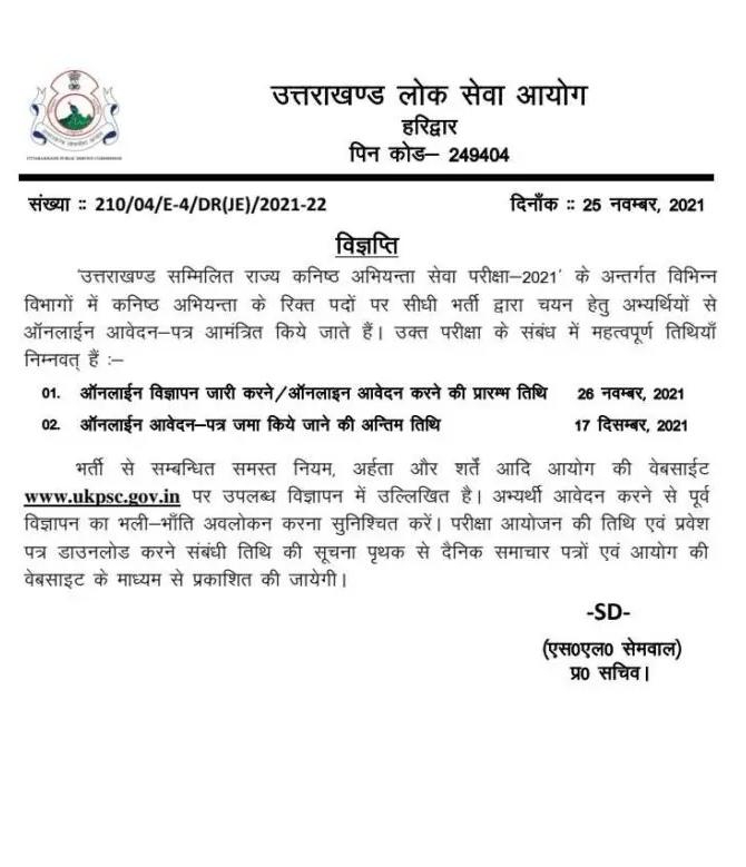 उत्तराखंड सम्मिलित राज्य कनिष्ठ अभियंता सेवा परीक्षा 2021 के अंतर्गत कनिष्ठ अभियंता के विभिन्न विभागों में खाली पड़े रिक्त पदों की सीधी भर्ती के लिए विज्ञप्ति जारी कर दी गई है।