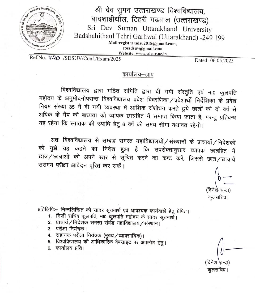 अभाविप की मांग पर श्री देव सुमन विश्वविद्यालय से संबधित महाविद्यालयों के छात्र-छात्राओं को सूचित किया जाता है कि अगर कोई विद्यार्थी वर्ष 2019,2020,2021 में वार्षिक पद्धति से प्रथम किया हो और अब द्वितीय या तृतीय वर्ष में परीक्षा फॉर्म भरवाना चाहता है लेकिन विश्वविद्यालय द्वारा पूर्व नियम के अनुसार 2 साल से अधिक अंतराल के उपरांत परीक्षा फॉर्म या परीक्षा में बैठने की अनुमति से मना किया गया हो,