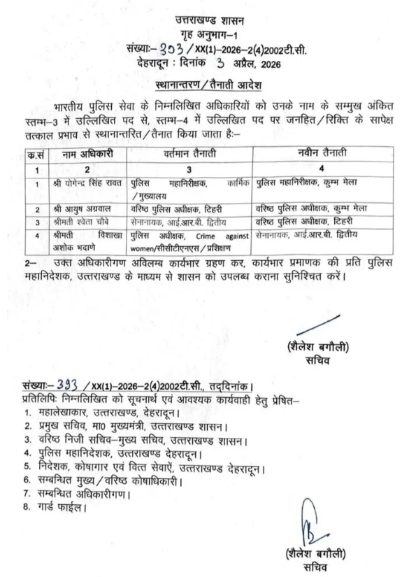 वहीं शासन ने अन्य प्रशासनिक फेरबदल भी किए हैं। आईपीएस श्वेता चौबे को टिहरी गढ़वाल जिले का वरिष्ठ पुलिस अधीक्षक (एसएसपी) नियुक्त किया गया है। इस पद पर अब तक आयुष अग्रवाल कार्यभार संभाल रहे थे।