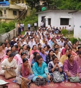 एक दिवसीय धरना प्रदर्शन के पूर्व निर्धारित कार्यक्रम के अनुसार विकास खंड चम्बा के सभी शिक्षक/शिक्षिका बारिश के बाबजूद भी अपनी मांगों को मनवाने के लिए अवकाश लेकर धरना स्थल पर पहुंचे।