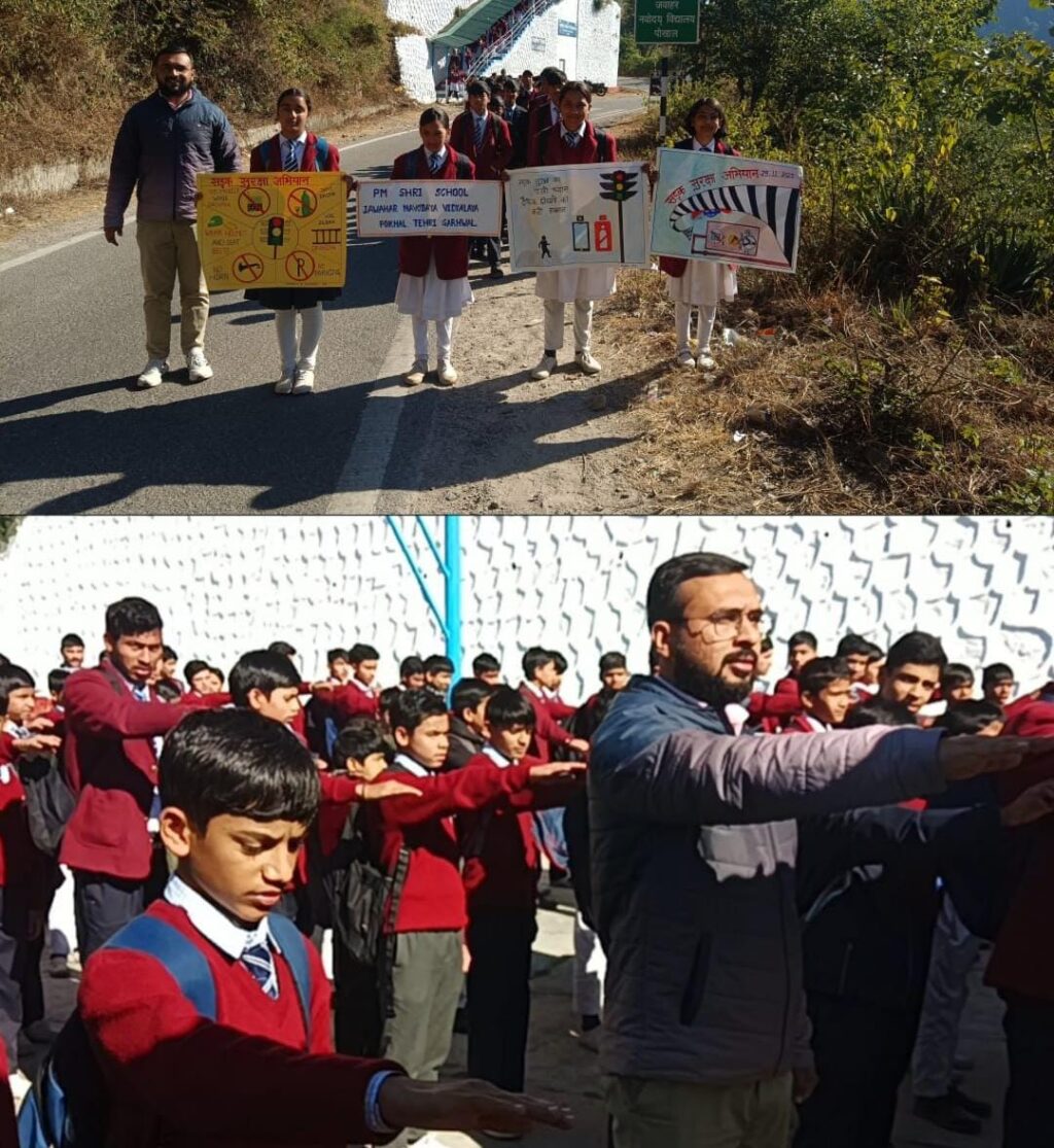 पौखाल (टिहरी गढ़वाल), 29 नवंबर: पीएम श्री स्कूल जवाहर नवोदय विद्यालय, पौखाल में सड़क सुरक्षा अभियान के अंतर्गत “हेलमेट पहनो – जीवन बचाओ” शपथ कार्यक्रम और जागरूकता रैली का आयोजन किया गया। कार्यक्रम का उद्देश्य छात्र- छात्राओं एवं समुदाय को सड़क सुरक्षा के प्रति जागरूक करना रहा।