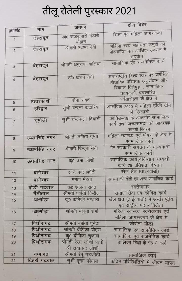 वीरांगना तीलू रौतेली पुरस्कार सामाजिक, शिक्षा, साहित्य, वीरता एवं साहस, कोविड काल में मदद, खेल, पर्यावरण आदि के क्षेत्र में कार्य पर महिलाओं को दिया जाता है, लेकिन इस बार सत्तारूढ़ पार्टी से संबंधित राजनीतिक क्षेत्र की महिलाओं के नाम भी सूची शामिल कर दिए गए।