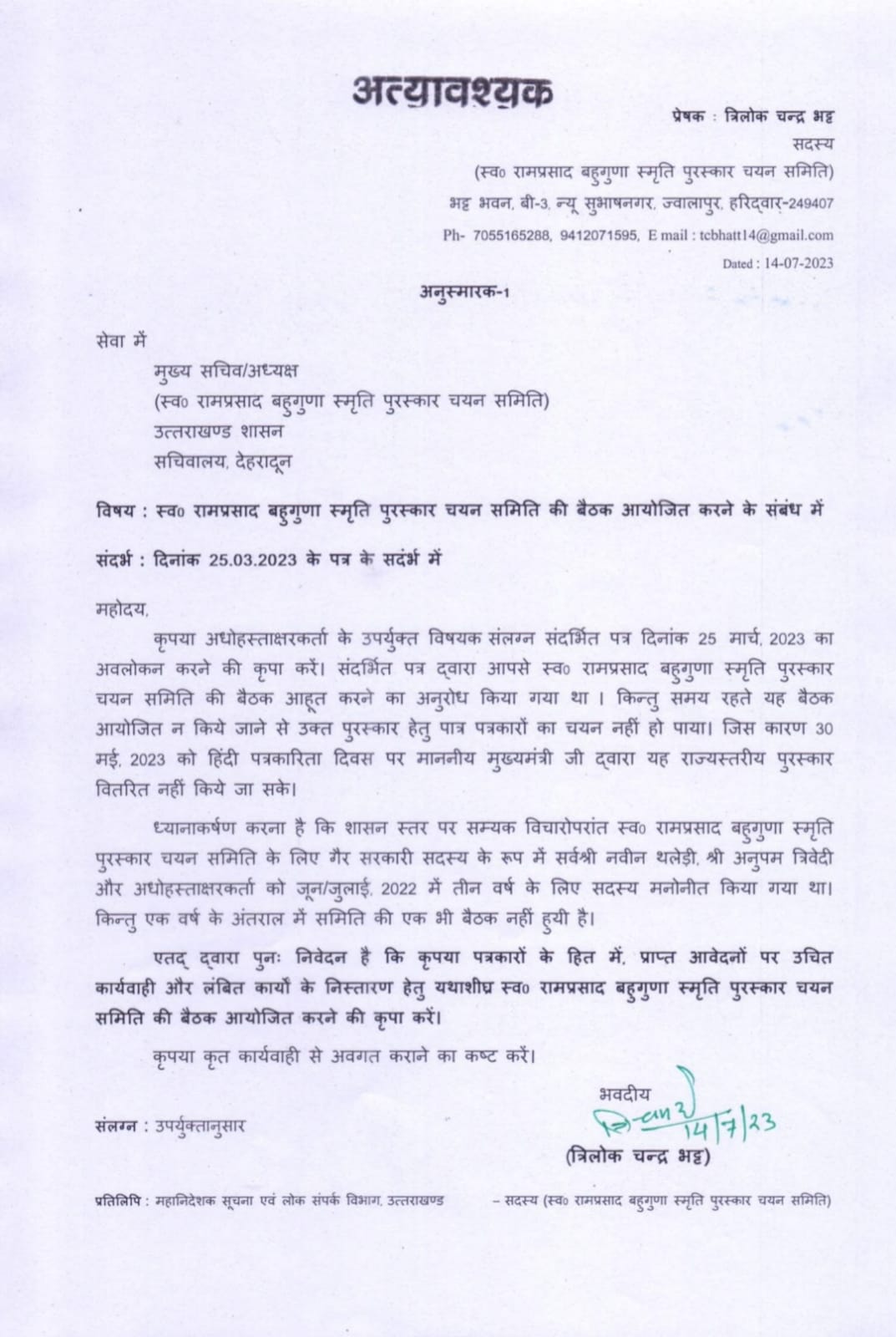 पत्र की प्रति समिति के सदस्य महानिदेशक सूचना एवं लोक संपर्क विभाग उत्तराखण्ड को भी भेजी गयी है।