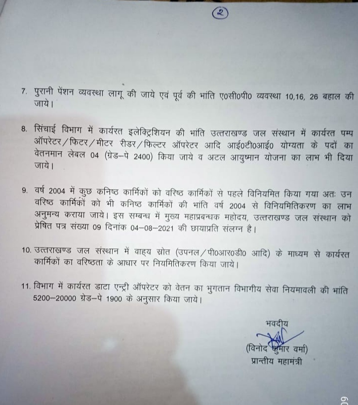 संगठन की प्रमुख मांगो में वर्ष 2003 में नियमित कर्मचारियों को पीडब्ल्यूडी एवं सिंचाई विभाग के वर्क चार्ज कर्मचारियों की भांति वर्ष 1996 से सेवा लाभ प्रदान करना.