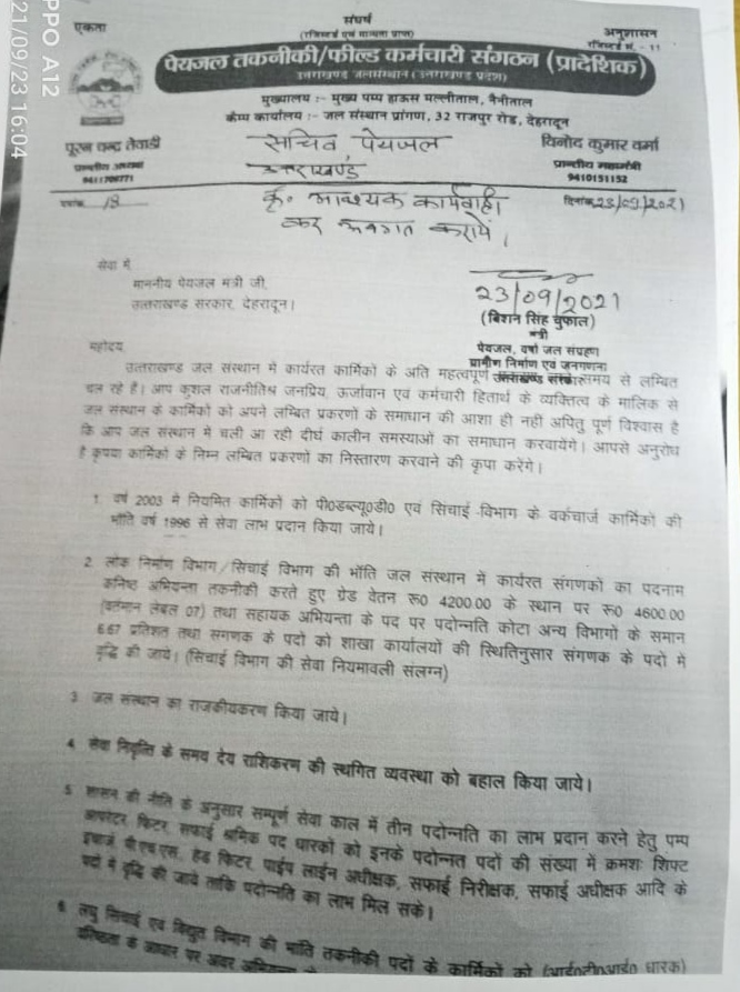 जानकारी के अनुसार उत्तराखंड जल संस्थान में कार्यरत कार्मिकों के महत्वपूर्ण प्रकरण काफी लंबे समय से लंबित चल रहे थे जिस पर पेयजल तकनीकी/ फील्ड कर्मचारी संगठन ने कर्मचारियों की आवाज उठाते हुए पेयजल मंत्री से मिलकर इन प्रकरणों को शीघ्र अति शीघ्र समाधान कराने हेतु शिष्टाचार भेंट की. इस वार्ता में पेयजल मंत्री ने समस्याओं को शीघ्र समाधान कराने का आश्वासन दिया तथा सचिव पेयजल उत्तराखंड को आवश्यक कार्यवाही करते हुए उन्हें अवगत कराने का निर्देश दिया.