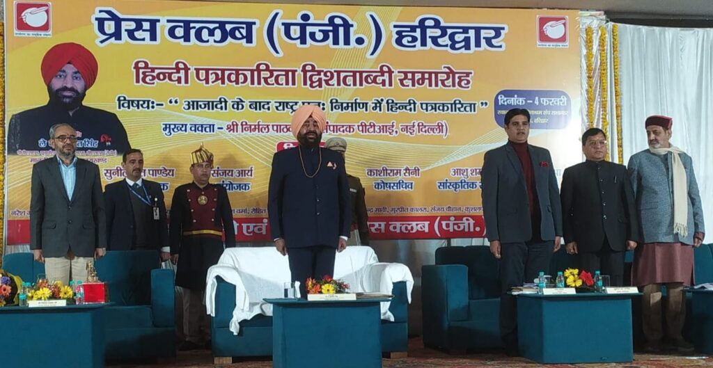 हरिद्वार, 4 फरवरी: प्रेस क्लब द्वारा हिंदी पत्रकारिता द्वि शताब्दी समारोह में आजादी के बाद राष्ट्र पुनः निर्माण में हिंदी पत्रकारिता विषय संगोष्ठी का आयोजन किया गया।