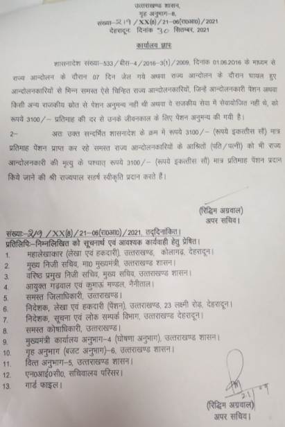 अतः उक्त सन्दर्भित शासनादेश के क्रम में रूपये 3100 /- (रूपये इकत्तीस सौ) मात्र प्रतिमाह पेंशन प्राप्त कर रहे समस्त राज्य आन्दोलनकारियों के आश्रितों (पति/पत्नी) को भी राज्य आन्दोलनकारी की मृत्यु के पश्चात् रूपये 3100/- (रूपये इकत्तीस सौ ) मात्र प्रतिमाह पेंशन प्रदान किये जाने की राज्यपाल सहर्ष स्वीकृति प्रदान करते हैं।