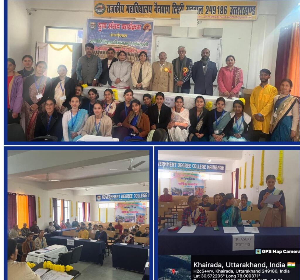 आज दिनांक 2 दिसंबर 2025 को राजकीय महाविद्यालय नैनबाग में राजनीति विज्ञान विभाग एवं आईक्यूएसी के संयुक्त तत्वावधान में युवा संसद कार्यक्रम का आयोजन किया गया कार्यक्रम में मुख्य अतिथि के तौर पर उद्यान पंडित श्री कुंदन सिंह पंवार निदेशक नारायणी नक्षत्र पौधशाला उपस्थित रहे ।