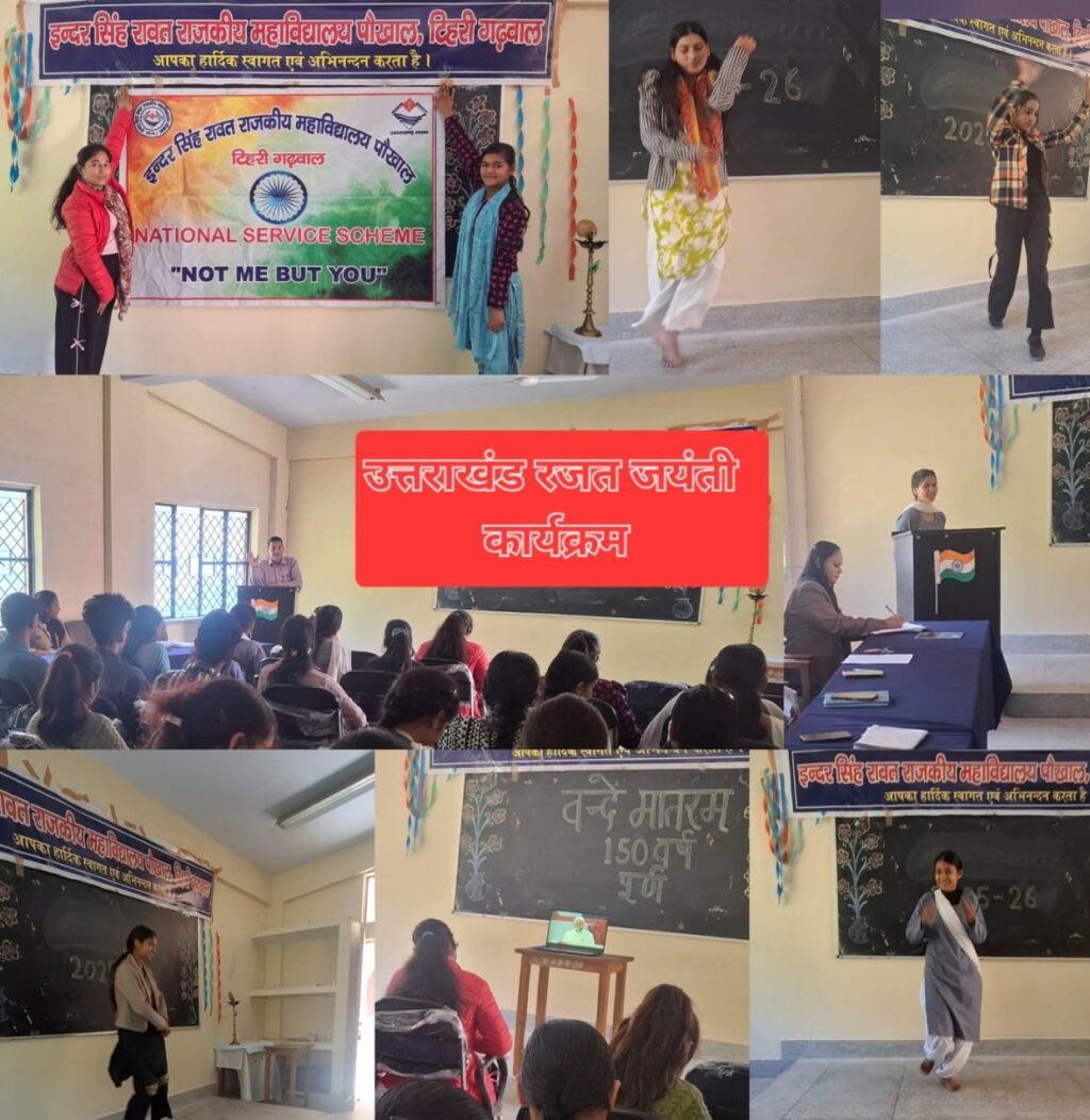 इन्दर सिंह रावत राजकीय महाविद्यालय पौखाल टिहरी गढ़वाल में आज दिनांक 07 नम्बर, 2025 को उत्तराखंड की रजत जयंती के उपलक्ष्य में एन.एस.एस इकाई, एंटी रैगिंग समिति, एंटी ड्रग समिति, करियर काउंसलिंग व महाविद्यालय आई.क्यू.ए.सी. के संयुक्त तत्वाधान में सांस्कृतिक के रंगारंग कार्यक्रमों के साथ साथ अन्य विभिन्न कार्यक्रमों का भी आयोजन कर रजत जयंती दिवस मनाया जा रहा है।