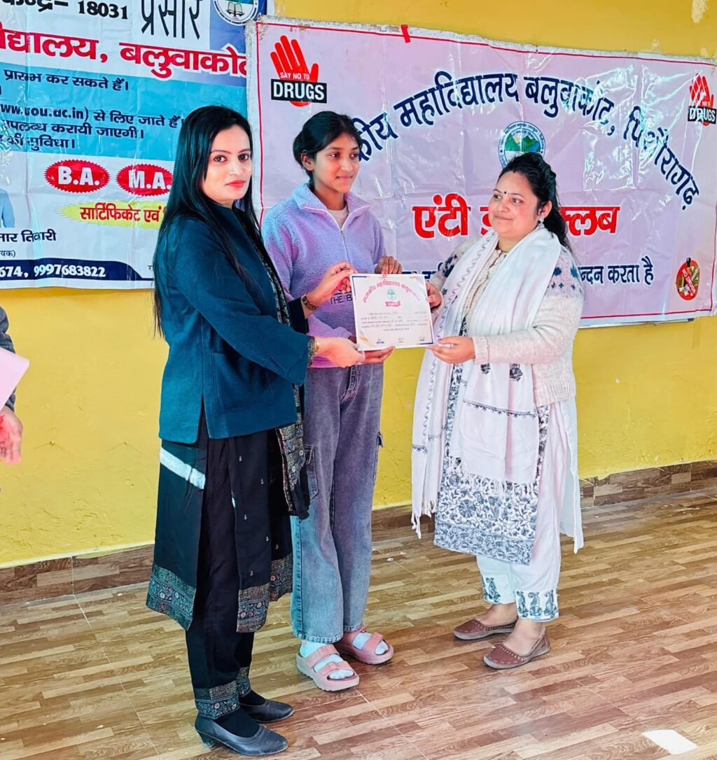 बीए प्रथम वर्ष के देवेंद्र कुमार के निबंध को प्रथम स्थान प्राप्त हुआ कु प्रेरणा दुखताल के निबंध को द्वितीय स्थान और कुमारी दीपशिखा के निबंध को तृतीय स्थान प्राप्त हुए स्लोगन प्रतियोगिता में प्रेरणा के स्लोगन “नशे की लत एक बीमारी है इससे दूर रहना समझदारी है” को प्रथम स्थान और लक्ष्मण राम टम्टा के स्लोगन को द्वितीय स्थान प्राप्त हुए विजय प्रतिभागियों को प्रमाण पत्र और पुरस्कार वितरित किए गए।