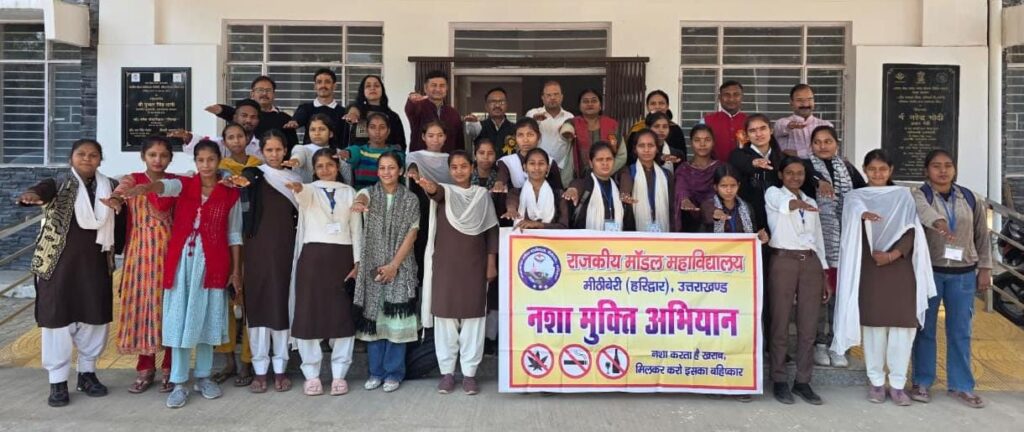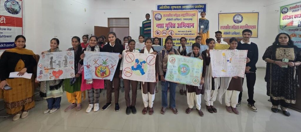 राजकीय मॉडल महाविद्यालय, मीठीबेरी हरिद्वार में एंटी ड्रग समिति एवं आई० क्यू० ए० सी० के संयुक्त तत्वावधान में नशा मुक्त उत्तराखंड अभियान के अंतर्गत प्रथम सत्र में प्राचार्य प्रोफेसर अर्चना गौतम की अध्यक्षता में समस्त महाविद्यालय के कर्मचारियों और छात्र-छात्राओं ने सामूहिक प्रतिज्ञा जागरूकता कार्यक्रम में प्रतिभाग किया, उसके पश्चात महाविद्यालय के छात्रों ने नशे से होने वाले दुष्प्रभावों को पोस्टर प्रतियोगिता के माध्यम से प्रदर्शित किया।