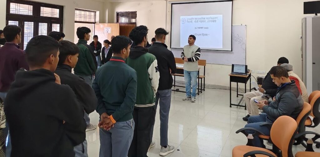 महाविद्यालय के प्रवक्ता डॉ. पुनीत वर्मा (बीसीए विभाग ) ने भी संविधान और लोकतांत्रिक मूल्यों पर अपने विचार छात्रों के समक्ष रखे। कार्यक्रम के अंतिम चरण में डॉ. दिनेश रावत ने छात्रों को संवैधानिक प्रावधानों और अनुच्छेदों की महत्वपूर्ण जानकारी सरल भाषा में प्रदान की।