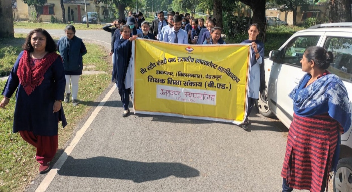 इसी क्रम में आज B.Ed विभाग के छात्र-छात्राओं द्वारा उत्तराखंड स्थापना दिवस के उपलक्ष में प्रभात फेरी निकाली गई, जिसका नेतृत्व डॉ रुचि बहुखंडी, डॉ कविता बडोला, डॉ प्रिंसी, डॉ सत्येंद्र, एवं डॉ अर्चना के द्वारा किया गया। कार्यक्रम में आज प्राध्यापक वर्ग में डॉ रोशन केष्टवाल,डॉ राखी डिमरी, डॉ पूजा राठौर, डॉ विनोद रावत, डॉ डी के भाटिया, डॉ अमित गुप्ता, डॉ मुक्ता डंगवाल, डॉ नीलम ध्यानी, डॉ माधुरी रावत, डॉ राजकुमारी भंडारी, डॉ अनुराग भंडारी, डॉ दीप्ति बगवाड़ी आदि, कर्मचारी वर्ग में श्री शूरवीर दास, श्रीमती मीनाक्षी, श्रीमती शीतल, श्री राजेश वर्मा, श्री सुनील मैठाणी, श्री दीपक बिष्ट, श्री आवेश आदि एवं छात्र छात्रा वर्ग में आशीष, मुस्कान, लक्ष्मी, रीना, वंदना, सीमा रोहित, उमेश आदि उपस्थित रहे।