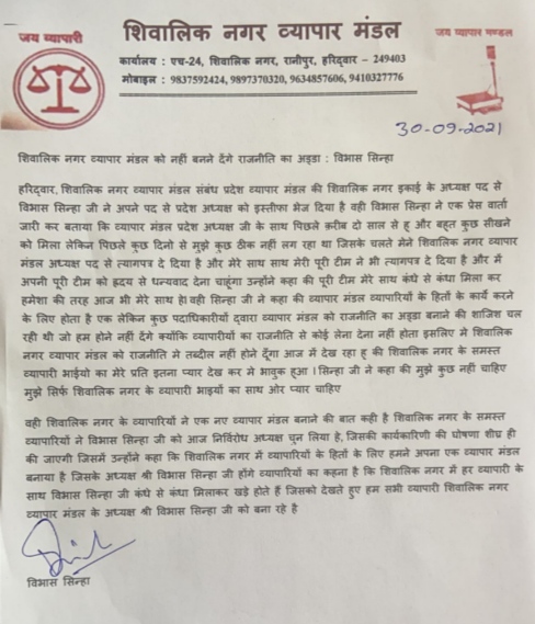 अभिनव कौशिक एनटीन्यूज़,हरिद्वार: शिवालिक नगर व्यापार मंडल संबंध प्रदेश व्यापार मंडल की शिवालिक नगर इकाई के अध्यक्ष पद से विभास सिन्हा ने अपने पद से प्रदेश अध्यक्ष को इस्तीफा भेज दिया है वही विभास सिन्हा ने एक प्रेस वार्ता जारी कर बताया कि व्यापार मंडल प्रदेश अध्यक्ष जी के साथ पिछले क़रीब दो साल से हु और बहुत कुछ सीखने को मिला लेकिन पिछले कुछ दिनो से मुझे कुछ ठीक नहीं लग रहा था जिसके चलते मेने शिवालिक नगर व्यापार मंडल अध्यक्ष पद से त्यागपत्र दे दिया है और मेरे साथ साथ मेरी पूरी टीम ने भी त्यागपत्र दे दिया है और में अपनी पूरी टीम को ह्रदय से धन्यवाद देना चाहूंगा उन्होंने कहा की पूरी टीम मेरे साथ कंधे से कंधा मिला कर हमेशा की तरह आज भी मेरे साथ हेl