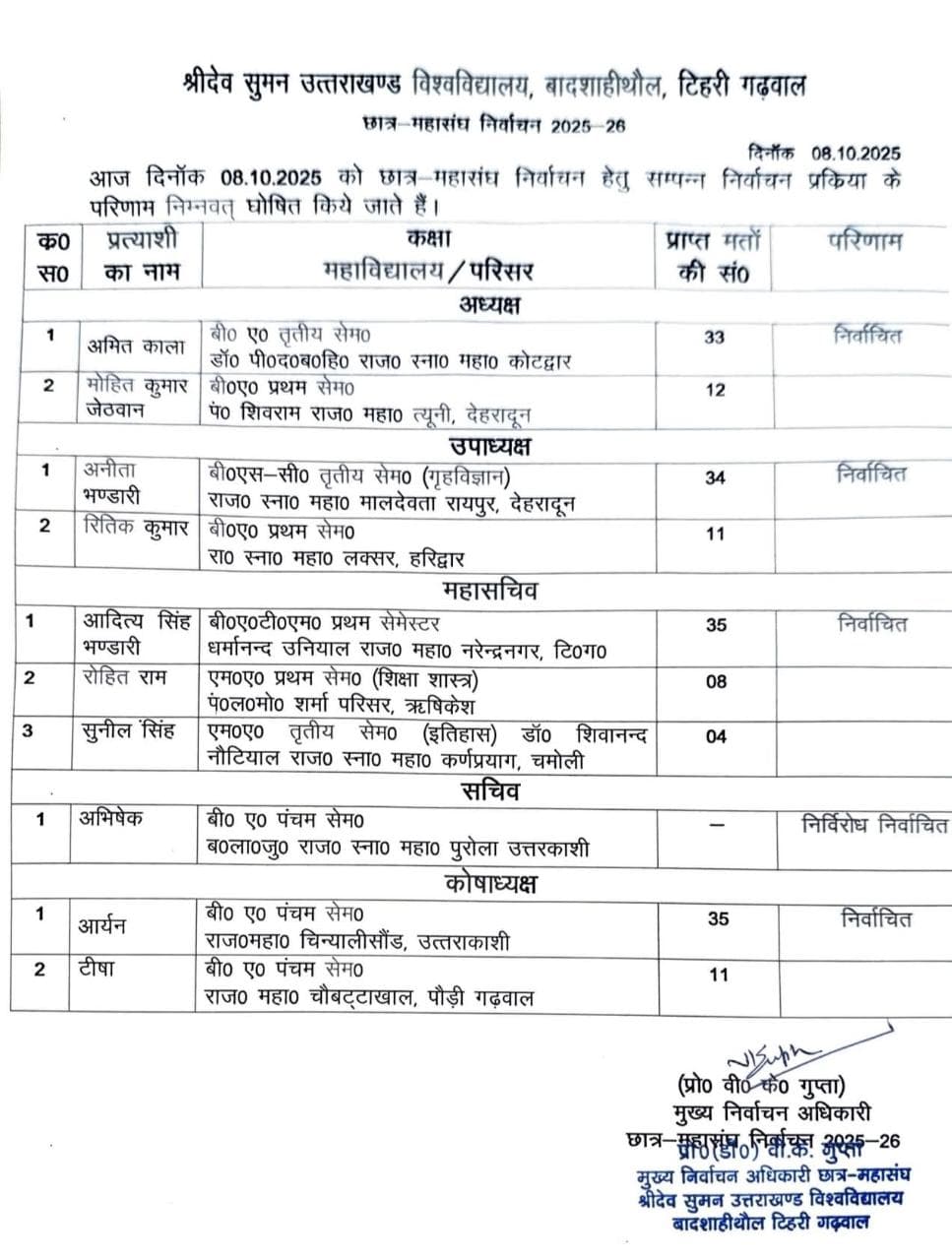 श्रीदेव सुमन उत्तराखण्ड विश्वविद्यालय, बादशाहीथौल, टिहरी गढ़वाल के छात्र महासंघ निर्वाचन 2025-26 में विद्यार्थी परिषद की क्लीन स्वीप, अध्यक्ष सहित सभी पदों पर विद्यार्थी परिषद के प्रत्याशियों का कब्जा।