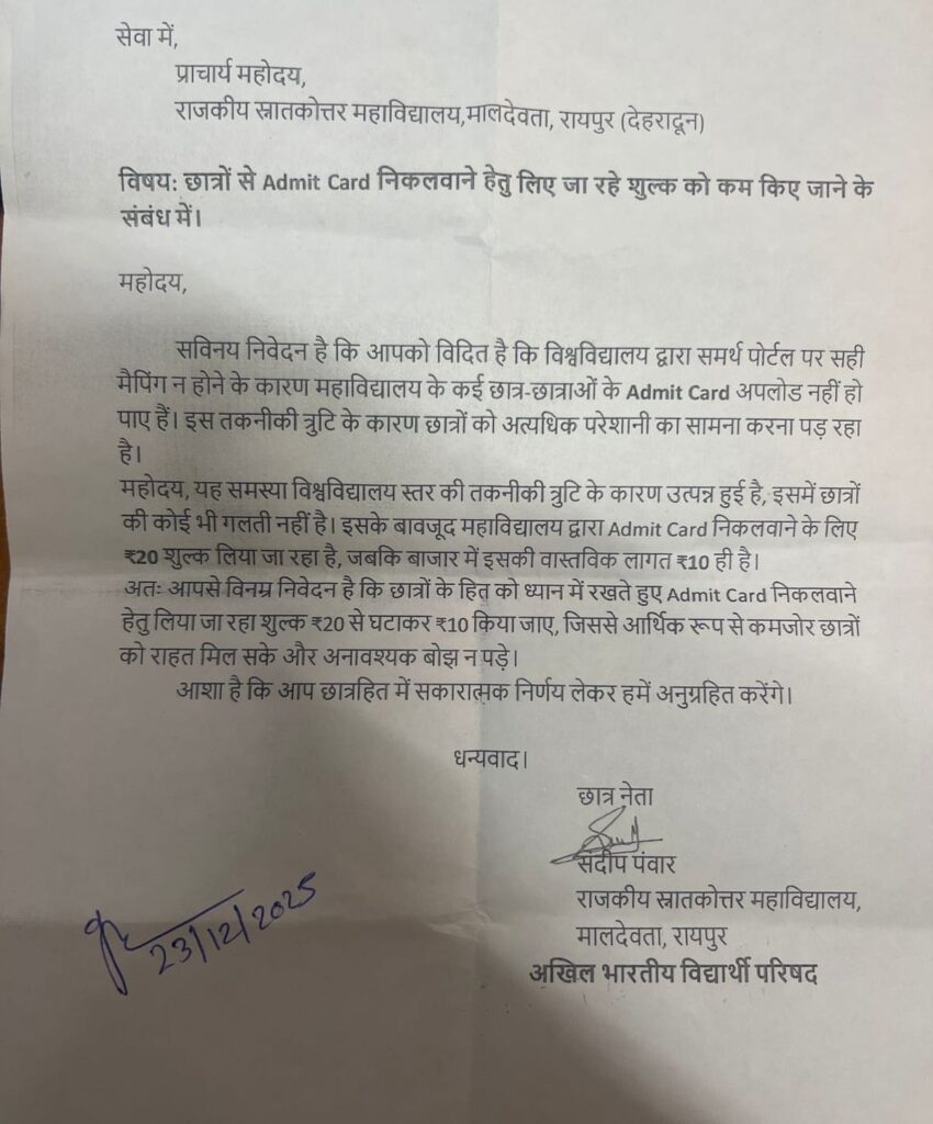 इस गंभीर समस्या को लेकर आज छात्र नेता संदीप पंवार द्वारा प्राचार्य महोदय को ज्ञापन सौंपा गया और तत्काल बातचीत की मांग की गई, क्योंकि अगले दिन सुबह से परीक्षाएँ प्रारंभ होनी हैं और उसी समय Admit Card भी निकाले जाने हैं।