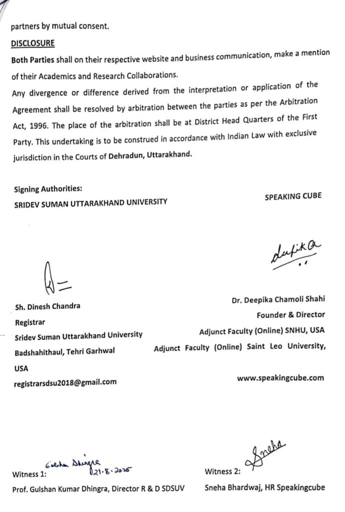 विश्वविद्यालय की ओर से रजिस्ट्रार श्री दिनेश चंद्र तथा स्पीकिंगक्यूब की संस्थापिका एवं निदेशक डॉ. दीपिका चमोली शाही ने इस समझौते पर हस्ताक्षर किए। इस साझेदारी के तहत छात्रों के लिए पेशेवर विकास, सुपर स्पेशलाइज्ड कोर्सेज, व्यवहारिक प्रशिक्षण और स्टार्टअप्स के माध्यम से सामाजिक उद्यमिता को बढ़ावा मिलेगा। इसके साथ ही मानसिक स्वास्थ्य और स्वास्थ्य जागरूकता से जुड़े दिवस भी संयुक्त रूप से मनाए जाएंगे।