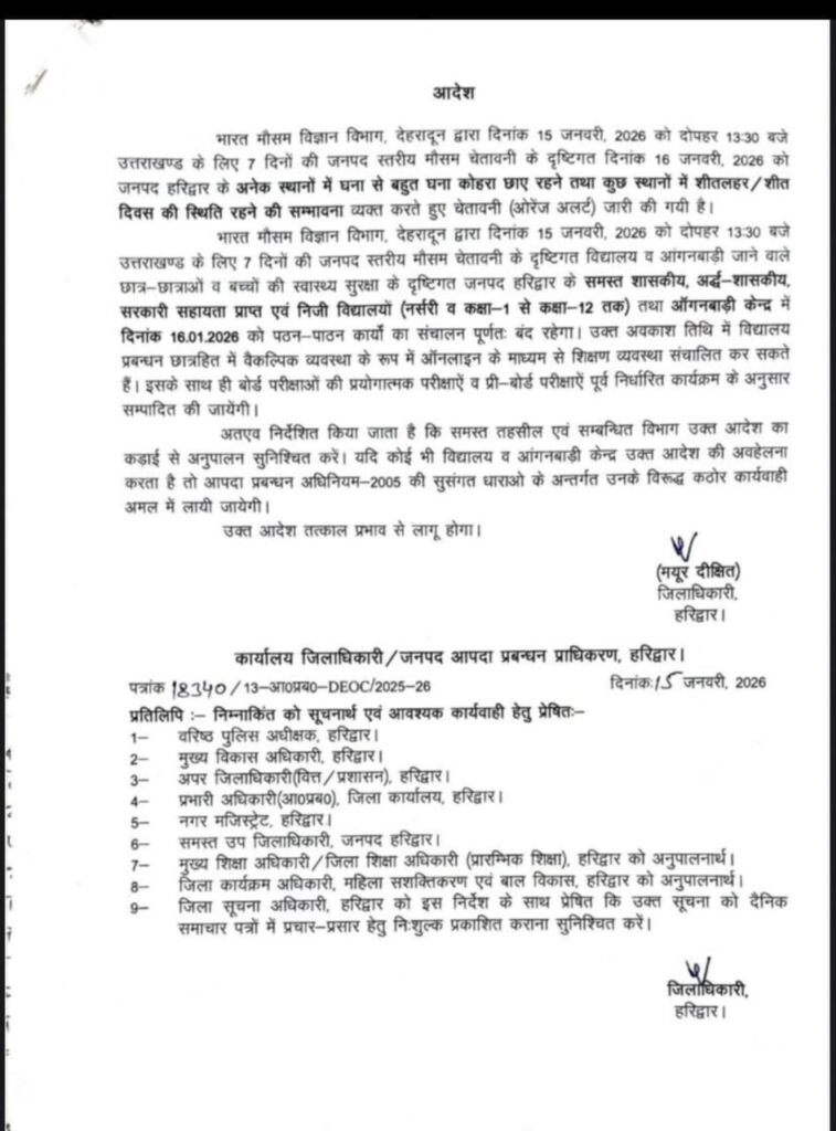 हरिद्वार। घने कोहरे व भीषण सर्दी के कारण मौसम विभाग द्वारा जारी किए गए पूर्वानुमान के दृष्टिगत जिला अधिकारी मयूर दीक्षित ने जनपद के समस्त शासकीय, अशासकीय किया विद्यालयों आंगनबाड़ी केंद्रों में 16 जनवरी का अवकाश घोषित किया है। बोर्ड की प्रयोगात्मक व प्री बोर्ड परीक्षाएं जारी रहेंगी। आदेश की अवहेलना पर कार्यवाही होगी।