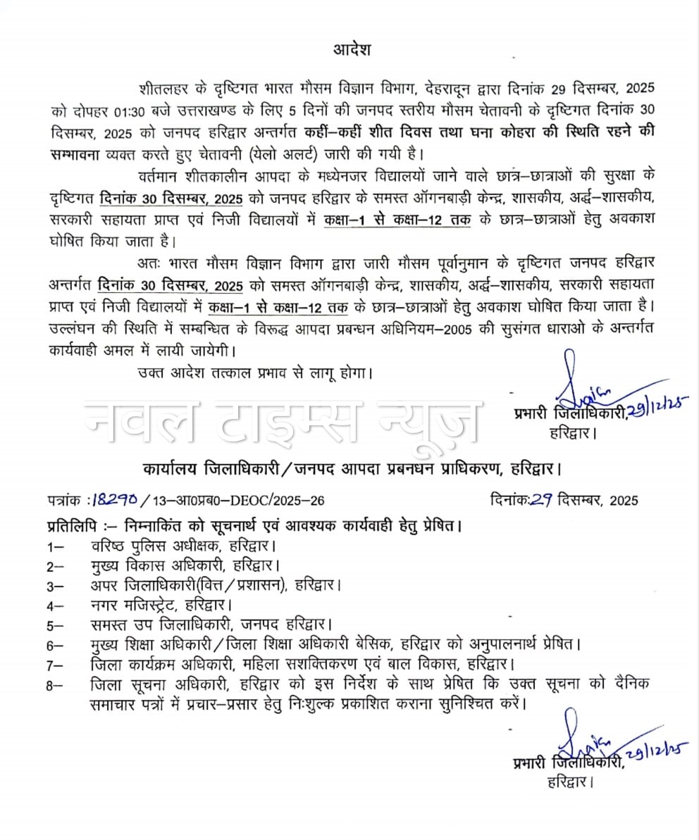 हरिद्वार। शीतलहर के दृष्टिगत जनपद हरिद्वार में नर्सरी से कक्षा 12 तक तक समस्त विद्यालय कल बंद रहेंगे। प्रभारी जिलाधिकारी के मुताबिक आदेश का उल्लंघन करने पर प्रभावी कार्रवाई अमल में लाई जाएगी।