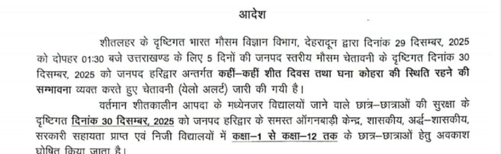 हरिद्वार। शीतलहर के दृष्टिगत जनपद हरिद्वार में नर्सरी से कक्षा 12 तक तक समस्त विद्यालय कल बंद रहेंगे। प्रभारी जिलाधिकारी के मुताबिक आदेश का उल्लंघन करने पर प्रभावी कार्रवाई अमल में लाई जाएगी।