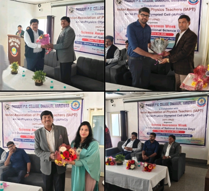 हरिद्वार: दिनांक 23 फरवरी 2026 को धनौरी पी.जी. कॉलेज, धनौरी द्वारा इंडियन एसोसिएशन ऑफ फिजिक्स टीचर्स – एशियन फिजिक्स ओलंपियाड (IAPT–APhO) के सहयोग से राष्ट्रीय विज्ञान दिवस के उपलक्ष्य में विज्ञान जागरूकता सप्ताह का शुभारंभ बड़े उत्साह एवं गरिमामय वातावरण में किया गया।