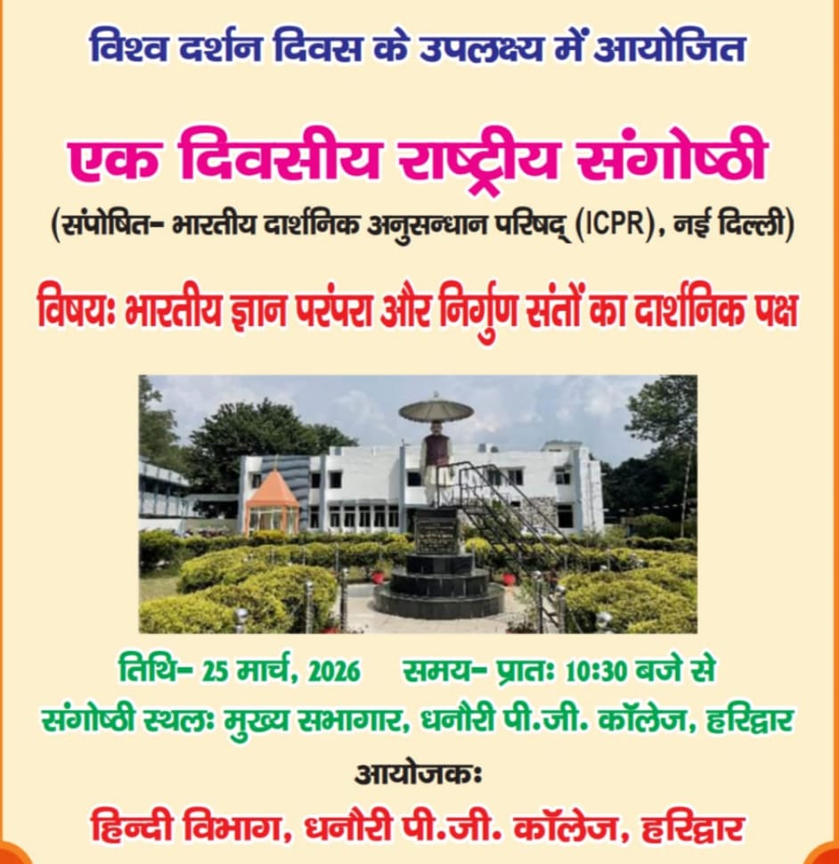 धनौरी पी.जी. कॉलेज, धनौरी, हरिद्वार में दिनांक 24 मार्च, 2026 को हिंदी विभाग, धनौरी पी.जी. कॉलेज द्वारा एक दिवसीय राष्ट्रीय संगोष्ठी का आयोजन किया जा रहा है।