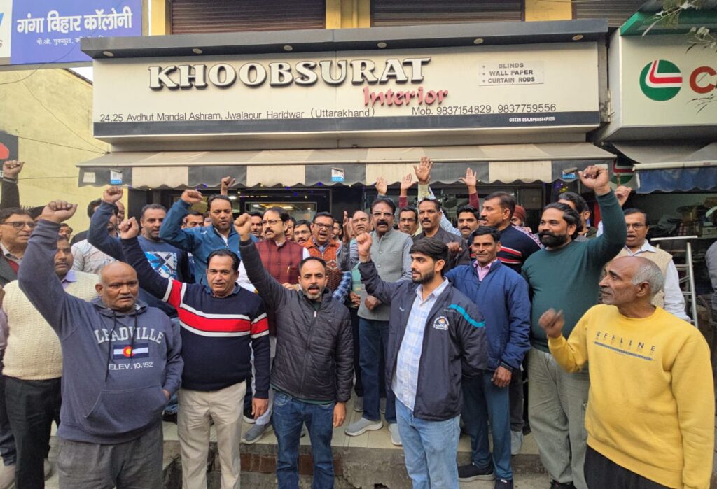 हरिद्वार, 22 नवम्बर। परिवहन विभाग द्वारा दुकानों पर छापेमारी के विरोध में प्रांतीय नगर उद्योग व्यापार मंडल ने नारेबाजी के साथ प्रदर्शन किया।