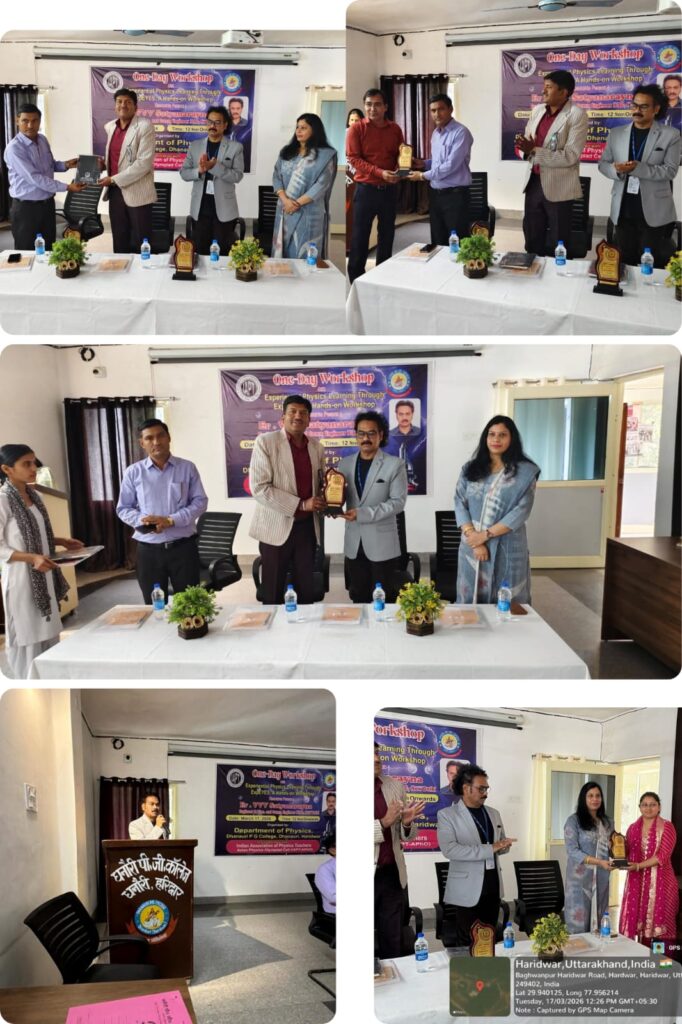 हरिद्वार: धनौरी (17 मार्च, 2026): धनौरी पी.जी. कॉलेज, धनौरी एवं AIPT–APHO के तत्वावधान में भौतिकी विभाग (Department of Physics) द्वारा आज महाविद्यालय के डॉ. पृथ्वी सिंह विकसित कॉन्फ्रेंस हॉल में “Experiential Physics Learning through ExpEYES: A Hands-on Workshop” विषय पर एक दिवसीय कार्यशाला का सफल आयोजन किया गया।