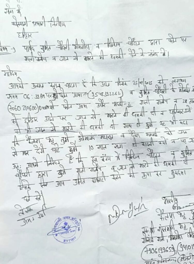 हरिद्वार: नगर निगम, हरिद्वार के वार्ड नं – 6, भीमगोड़ा के वर्तमान भाजपा पार्षद सुमित चौधरी ने कांग्रेस के पूर्व पार्षद कैलाश भट्ट को फोन पर मां बहन की गंदी-गंदी गालियां देते हुए 28 तारीख के बाद जान से मारने की धमकी दी है।