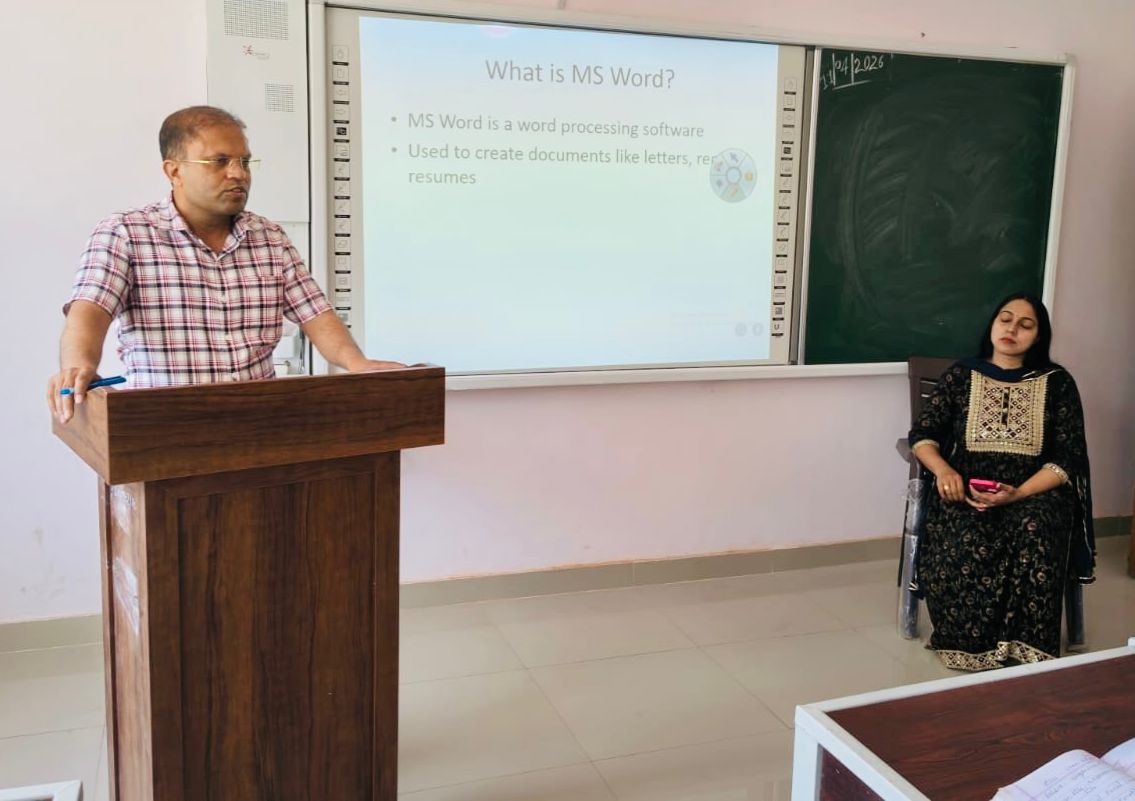 उन्होंने एमएस वर्ड तथा एमएस एक्सल के बारे में विस्तार से जानकारी प्रदान की एवं साथ ही एमएस ऑफ़िस के महत्वपूर्ण टूल्स के बारे में छात्र छात्राओं को अवगत कराया। साथ ही उन्होंने विगत तीन दिवस से चल रहे कोर्स से सम्बन्धित छात्र-छात्राओं से प्रश्नों को पूछा।