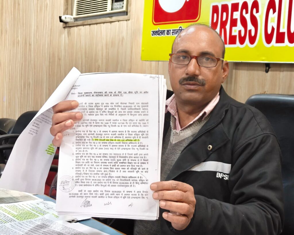 प्रैस क्लब में पत्रकारों से वार्ता करते हुए राजेश कुमार ने कहा कि इस संबंध में जिलाधिकारी को ज्ञापन देकर कार्रवाई की मांग की है। यदि कार्रवाई नहीं होती है तो वे जिलाधिकारी कार्यालय पर धरना देंगे। राजेश कुमार कहा कि वर्ष 2007-08 में भूमि के संबंध में विभिन्न स्तरों पर प्रक्रियाएं अपनाई गईं। जिनमें कथित रूप से नियमों की अनदेखी की गई।
