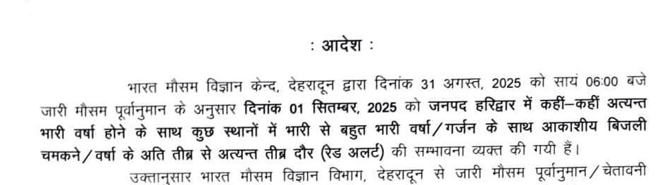 हरिद्वार : भारी बारिश के रेड अलर्ट के चलते कल 1 सितंबर को जनपद...